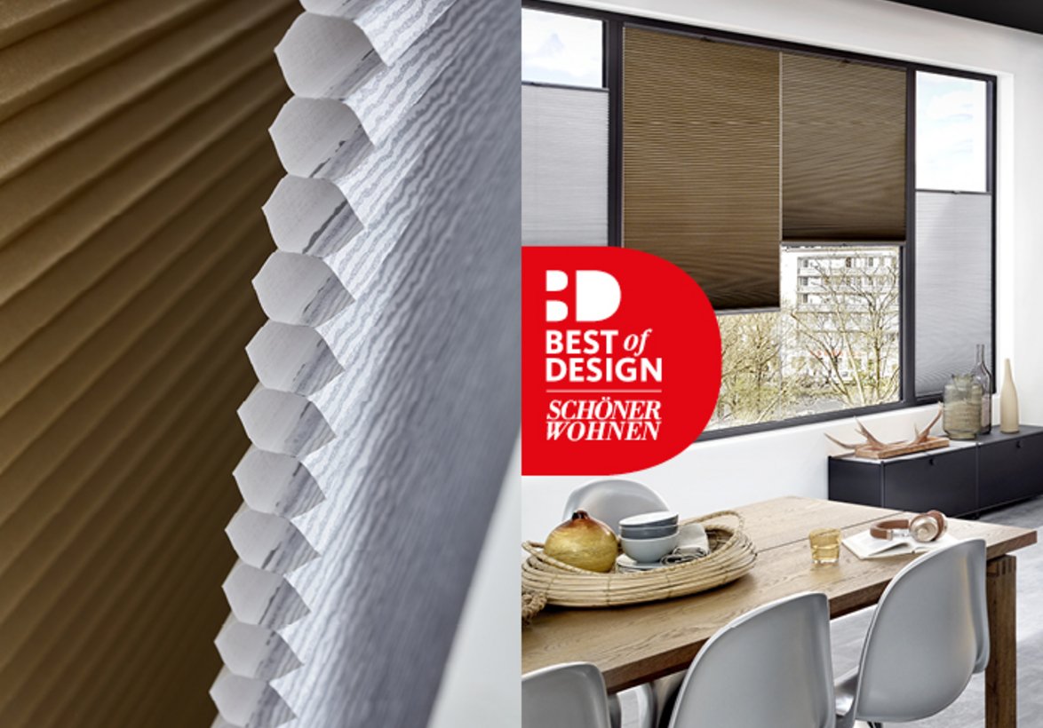 Die SCHÖNER WOHNEN zeichnet DUETTE® Wabenplissee in diesem Jahr mit dem BEST OF DESIGN Award aus. Mit diesem Preis hebt die Redaktion herausragende Wohnaccessoires hervor, die nicht nur in puncto Design, sondern auch in Bereichen wie Nachhaltigkeit, Ergonomie und Funktionalität überzeugen.